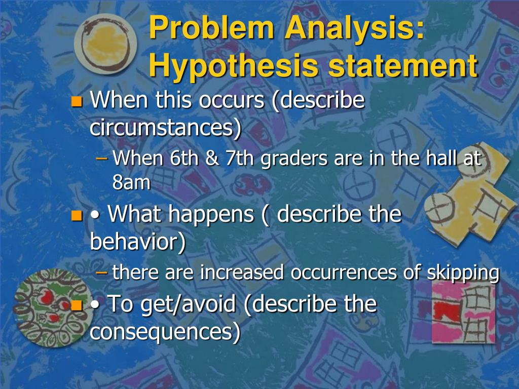Problem Analysis: Hypothesis statement • When this occurs (describe circumstances) • When 6th & 7th graders are in the hall at 8am • • What happens ( describe the behavior) • there are increased occurrences of skipping • • To get/avoid (describe the consequences)