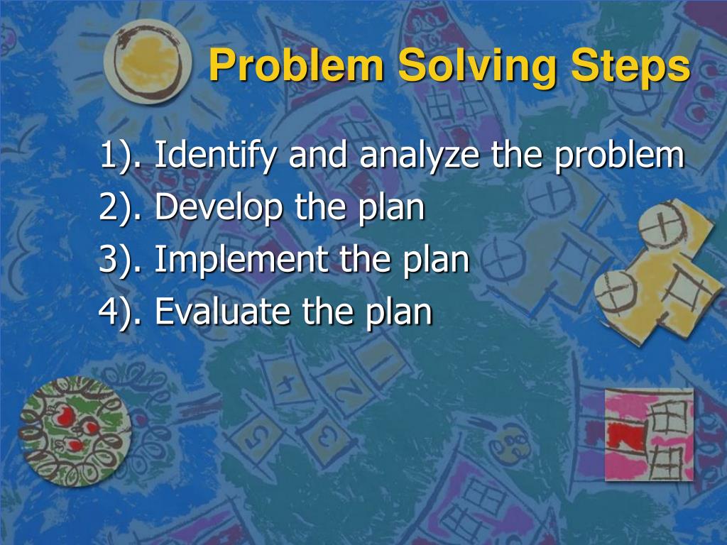 Problem Solving Steps 1). Identify and analyze the problem 2). Develop the plan 3). Implement the plan 4). Evaluate the plan