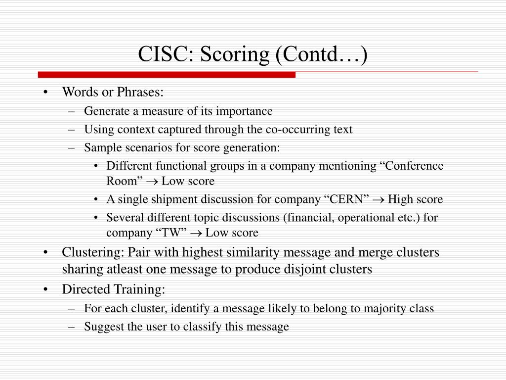CISC: Scoring (Contd…) • Words or Phrases: • Generate a measure of its importance • Using context captured through the co-occurring text • Sample scenarios for score generation: • Different functional groups in a company mentioning “Conference Room” Low score • A single shipment discussion for company “CERN” High score • Several different topic discussions (financial, operational etc.) for company “TW” Low score • Clustering: Pair with highest similarity message and merge clusters sharing atleast one message to produce disjoint clusters • Directed Training: • For each cluster, identify a message likely to belong to majority class • Suggest the user to classify this message