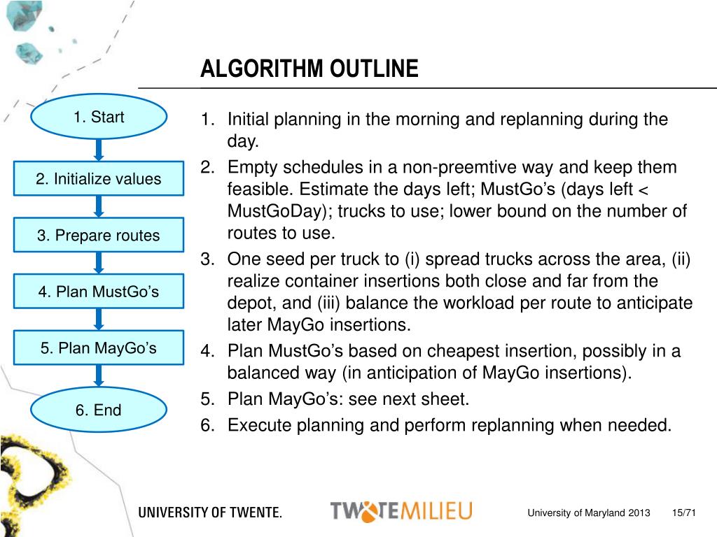 ALGORITHM OUTLINE 1. Start Initial planning in the morning and replanning during the day. Empty schedules in a non-preemtive way and keep them feasible. Estimate the days left; MustGo’s (days left < MustGoDay); trucks to use; lower bound on the number of routes to use. One seed per truck to (i) spread trucks across the area, (ii) realize container insertions both close and far from the depot, and (iii) balance the workload per route to anticipate later MayGoinsertions. Plan MustGo’sbased on cheapest insertion, possibly in a balanced way (in anticipation of MayGo insertions). Plan MayGo’s: see next sheet. Execute planning and perform replanning when needed. 2. Initializevalues 3. Prepare routes 4. Plan MustGo’s 5. Plan MayGo’s 6. End University of Maryland 2013