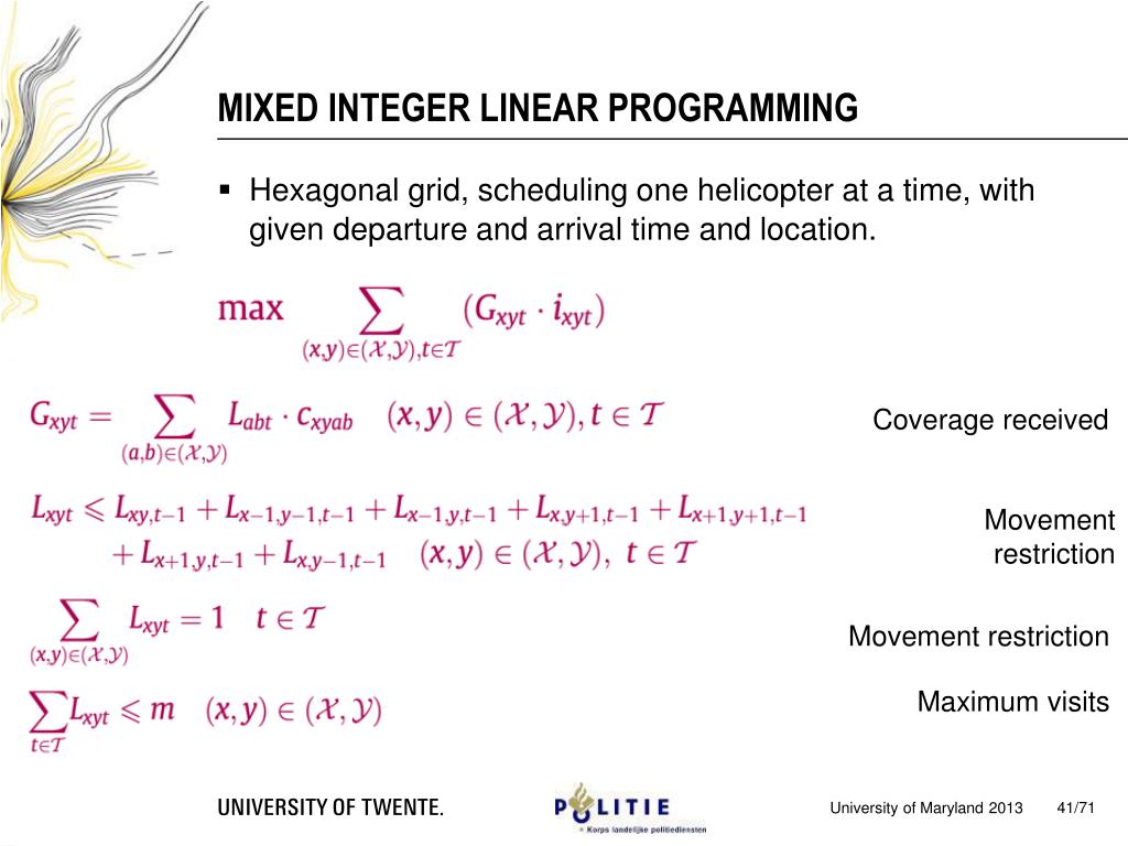 MIXED INTEGER LINEAR PROGRAMMING • Hexagonal grid, scheduling one helicopter at a time, with given departure and arrival time and location. Coverage received Movementrestriction Movement restriction Maximum visits University of Maryland 2013