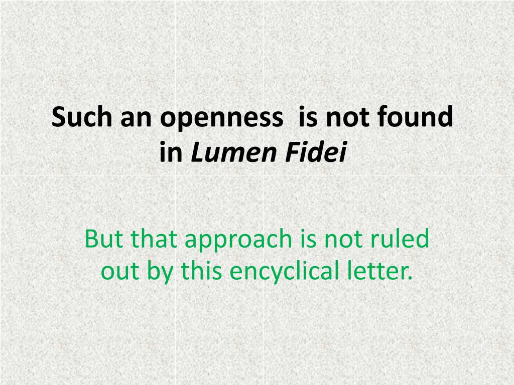 Such an openness is not found in Lumen Fidei But that approach is not ruled out by this encyclical letter.
