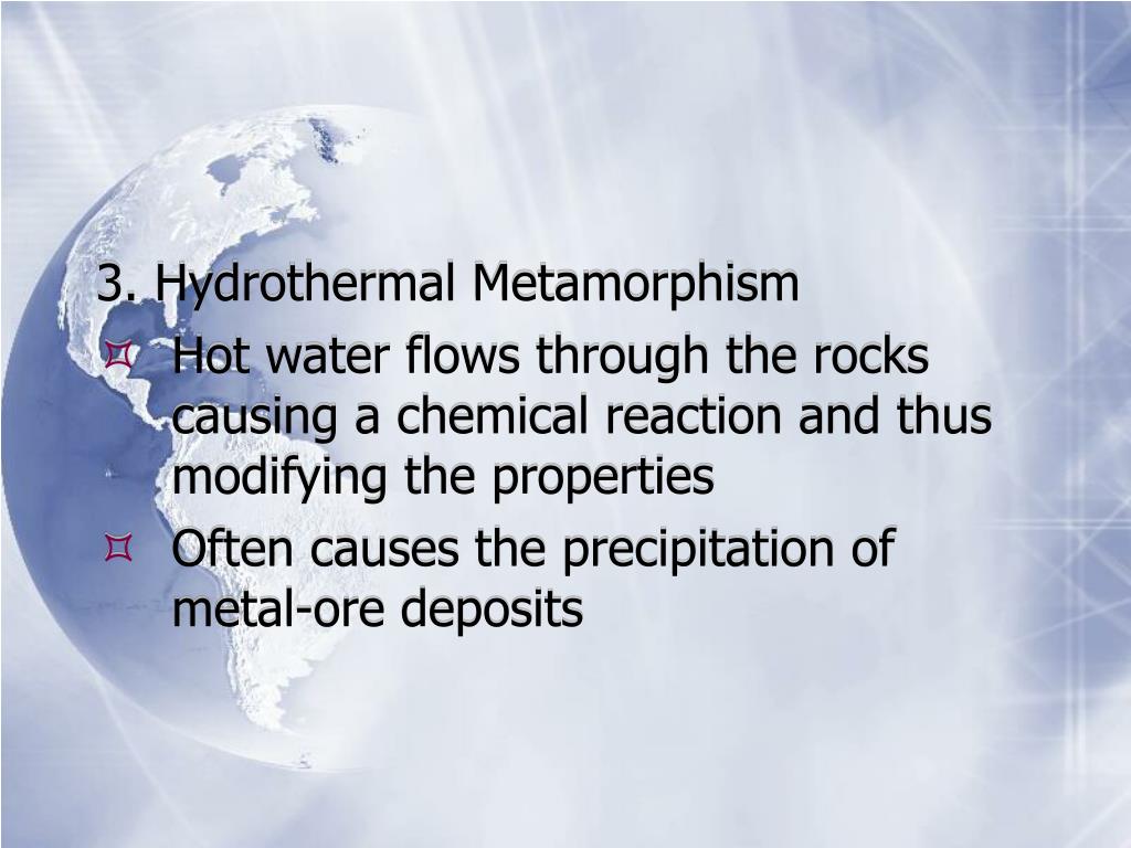 3. Hydrothermal Metamorphism • Hot water flows through the rocks causing a chemical reaction and thus modifying the properties • Often causes the precipitation of metal-ore deposits