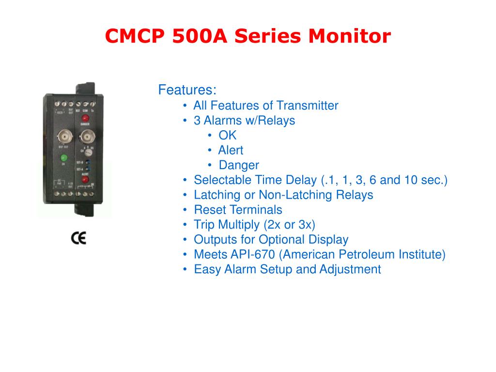 CMCP 500A Series Monitor • Features: • All Features of Transmitter • 3 Alarms w/Relays • OK • Alert • Danger • Selectable Time Delay (.1, 1, 3, 6 and 10 sec.) • Latching or Non-Latching Relays • Reset Terminals • Trip Multiply (2x or 3x) • Outputs for Optional Display • Meets API-670 (American Petroleum Institute) • Easy Alarm Setup and Adjustment
