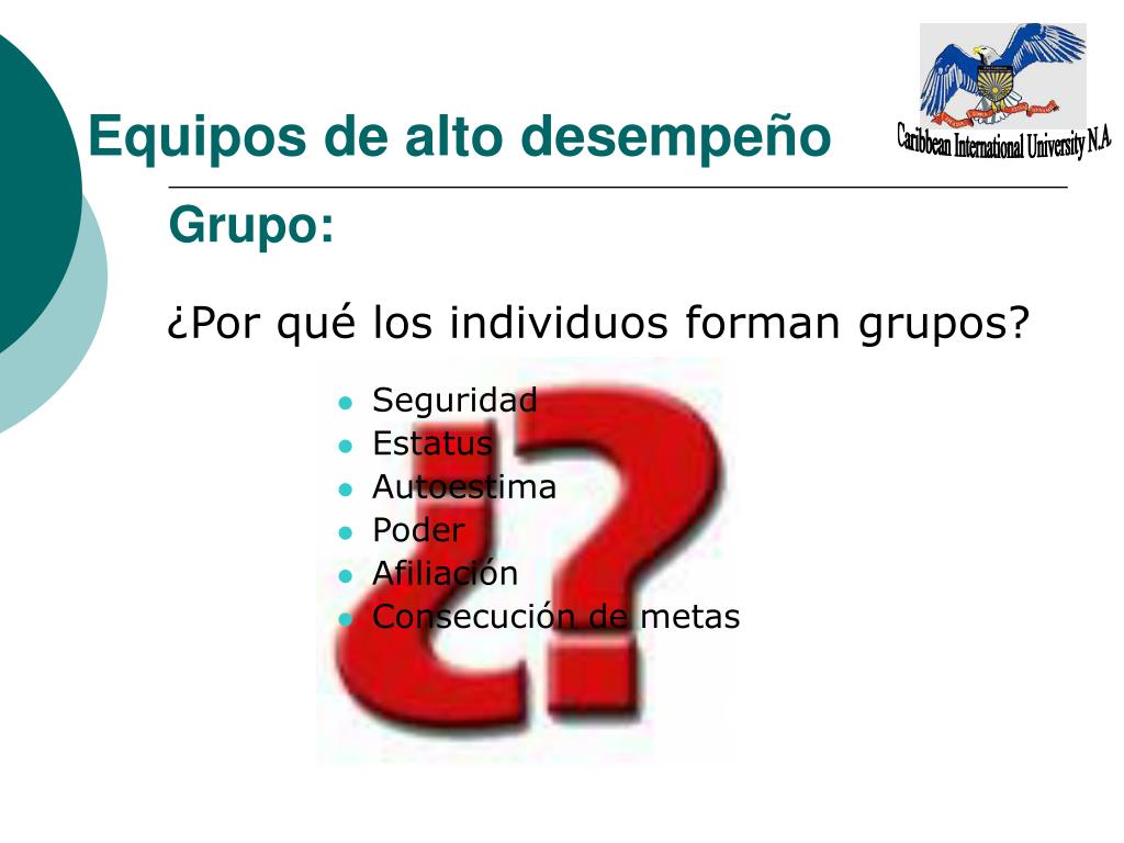 Caribbean International University N.A. Equipos de alto desempeño Grupo: • Seguridad • Estatus • Autoestima • Poder • Afiliación • Consecución de metas ¿Por qué los individuos forman grupos?