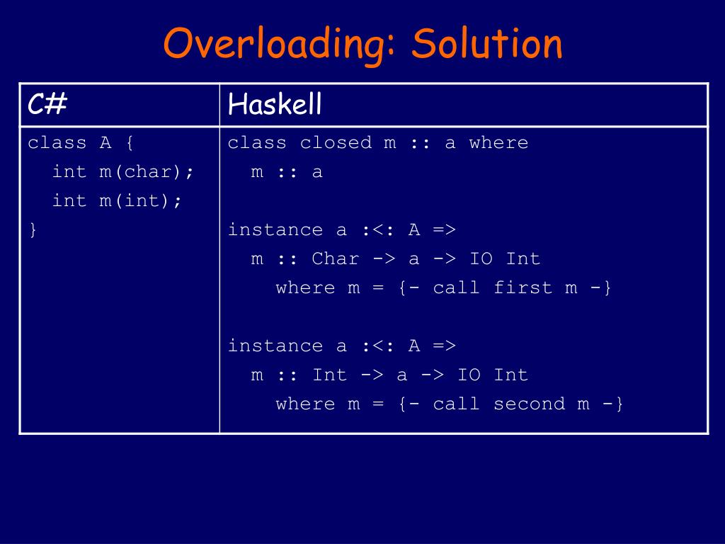 Overloading: Solution Only one method on A with Char argument possible, so commit: a :: A a # m '1' :: IO Int No methods on A with Bool argument possible, so reject: a # m True error: cannot satisfym :: Bool -> A -> c Only one method on A with pair argument, so commit: instance a :<: A => m :: (Int, Int) -> a -> IO Int a # m (x, y) :: IO Int (andx :: Int, y :: Int)
