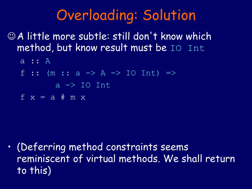 Overloading: Solution • A little more subtle: still don't know which method, but know result must be IO Int a :: A f :: (m :: a -> A -> IO Int) => a -> IO Int f x = a # m x • (Deferring method constraints seems reminiscent of virtual methods. We shall return to this)
