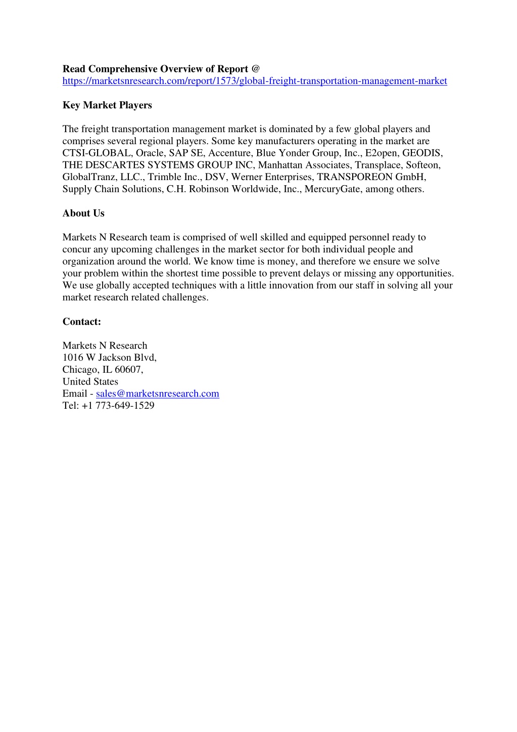 Read Comprehensive Overview of Report @ https://marketsnresearch.com/report/1573/global-freight-transportation-management-market Key Market Players The freight transportation management market is dominated by a few global players and comprises several regional players. Some key manufacturers operating in the market are CTSI-GLOBAL, Oracle, SAP SE, Accenture, Blue Yonder Group, Inc., E2open, GEODIS, THE DESCARTES SYSTEMS GROUP INC, Manhattan Associates, Transplace, Softeon, GlobalTranz, LLC., Trimble Inc., DSV, Werner Enterprises, TRANSPOREON GmbH, Supply Chain Solutions, C.H. Robinson Worldwide, Inc., MercuryGate, among others. About Us Markets N Research team is comprised of well skilled and equipped personnel ready to concur any upcoming challenges in the market sector for both individual people and organization around the world. We know time is money, and therefore we ensure we solve your problem within the shortest time possible to prevent delays or missing any opportunities. We use globally accepted techniques with a little innovation from our staff in solving all your market research related challenges. Contact: Markets N Research 1016 W Jackson Blvd, Chicago, IL 60607, United States Email - sales@marketsnresearch.com Tel: +1 773-649-1529