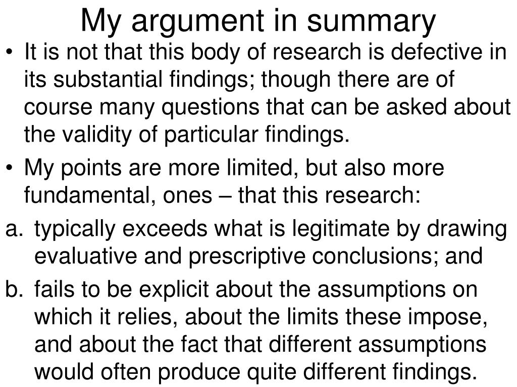 My argument in summary • It is not that this body of research is defective in its substantial findings; though there are of course many questions that can be asked about the validity of particular findings. • My points are more limited, but also more fundamental, ones – that this research: • typically exceeds what is legitimate by drawing evaluative and prescriptive conclusions; and • fails to be explicit about the assumptions on which it relies, about the limits these impose, and about the fact that different assumptions would often produce quite different findings.