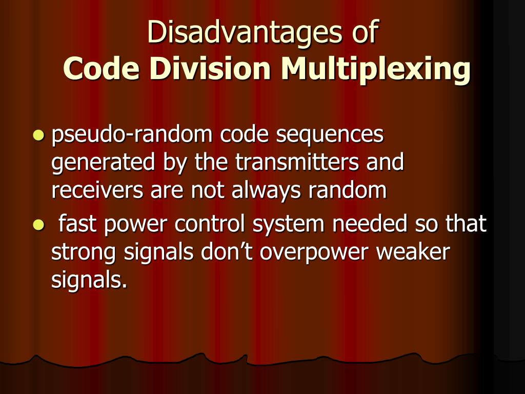 Disadvantages of Code Division Multiplexing • pseudo-random code sequences generated by the transmitters and receivers are not always random • fast power control system needed so that strong signals don’t overpower weaker signals.