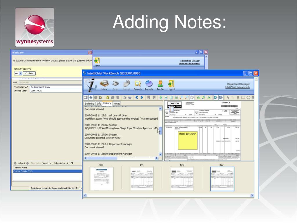 Payables Process Invoice is re-indexed into IntelliChief and matched to related documents Faxed invoices are electronically captured Invoice is electronically routed to proper inbox If approval is required, AP can forward to approver Invoice is entered into RentalMan Emailed invoices are digitized using Capture Driver Payment is made via ACH of laser check created using Formtastic Mailed invoices are scanned and digitized Check is filed into IntelliChief and matched with related documents