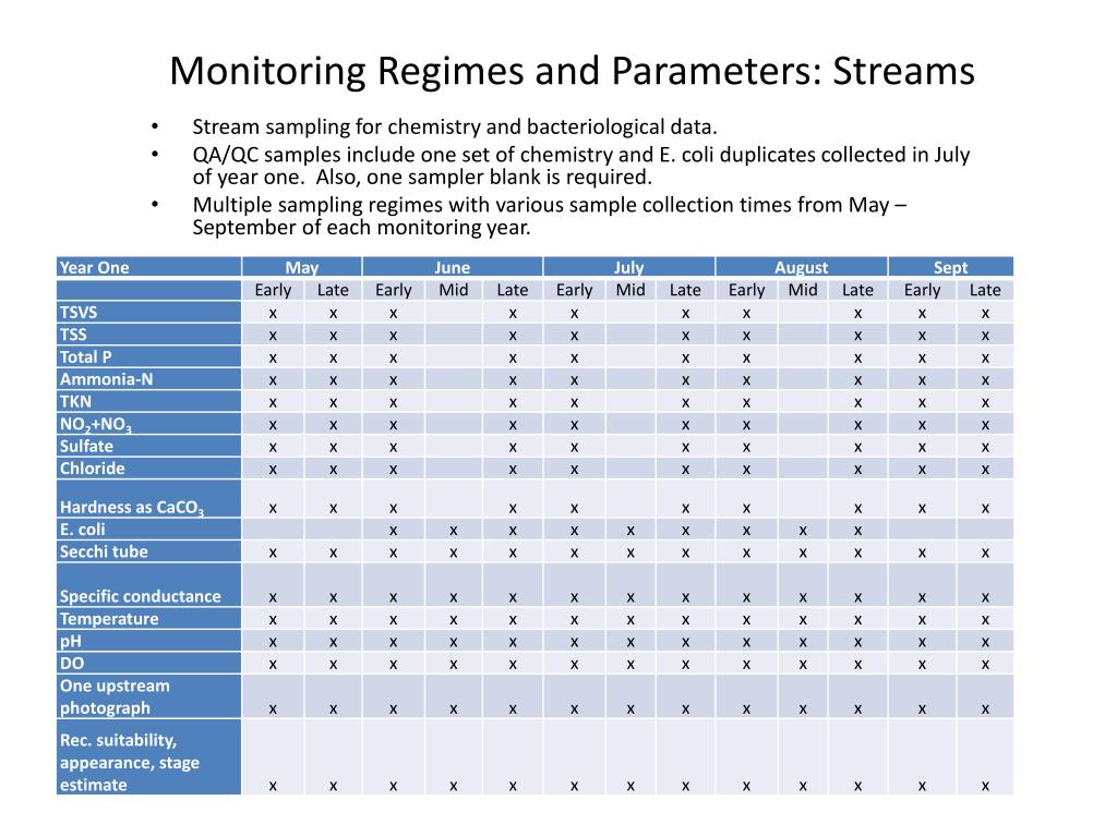 Monitoring Regimes and Parameters: Streams • Stream sampling for chemistry and bacteriological data. • QA/QC samples include one set of chemistry and E. coli duplicates collected in July of year one. Also, one sampler blank is required. • Multiple sampling regimes with various sample collection times from May – September of each monitoring year.