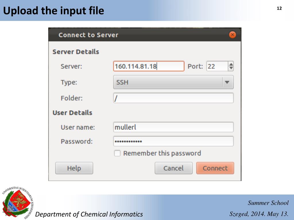 Upload the input file Summer School • Szeged, 2014. May 13. Department of Chemical Informatics
