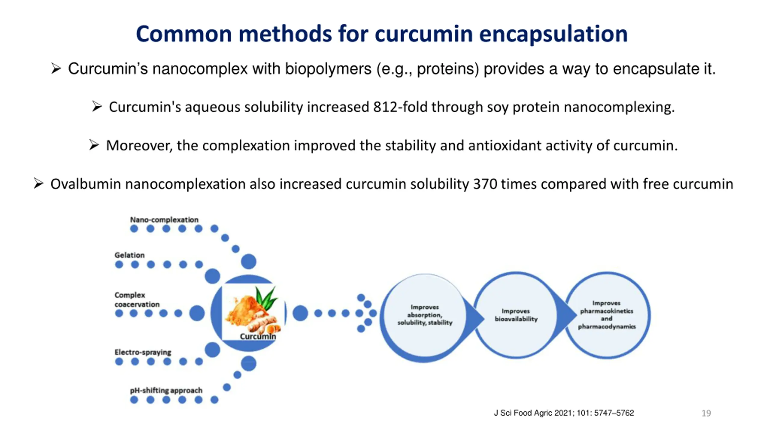 Common methods for curcumin encapsulation Curcumin’s nanocomplex with biopolymers (e.g., proteins) provides a way to encapsulate it. Curcumin's aqueous solubility increased 812-fold through soy protein nanocomplexing. Moreover, the complexation improved the stability and antioxidant activity of curcumin. Ovalbumin nanocomplexation also increased curcumin solubility 370 times compared with free curcumin J Sci Food Agric 2021; 101: 5747–5762 19