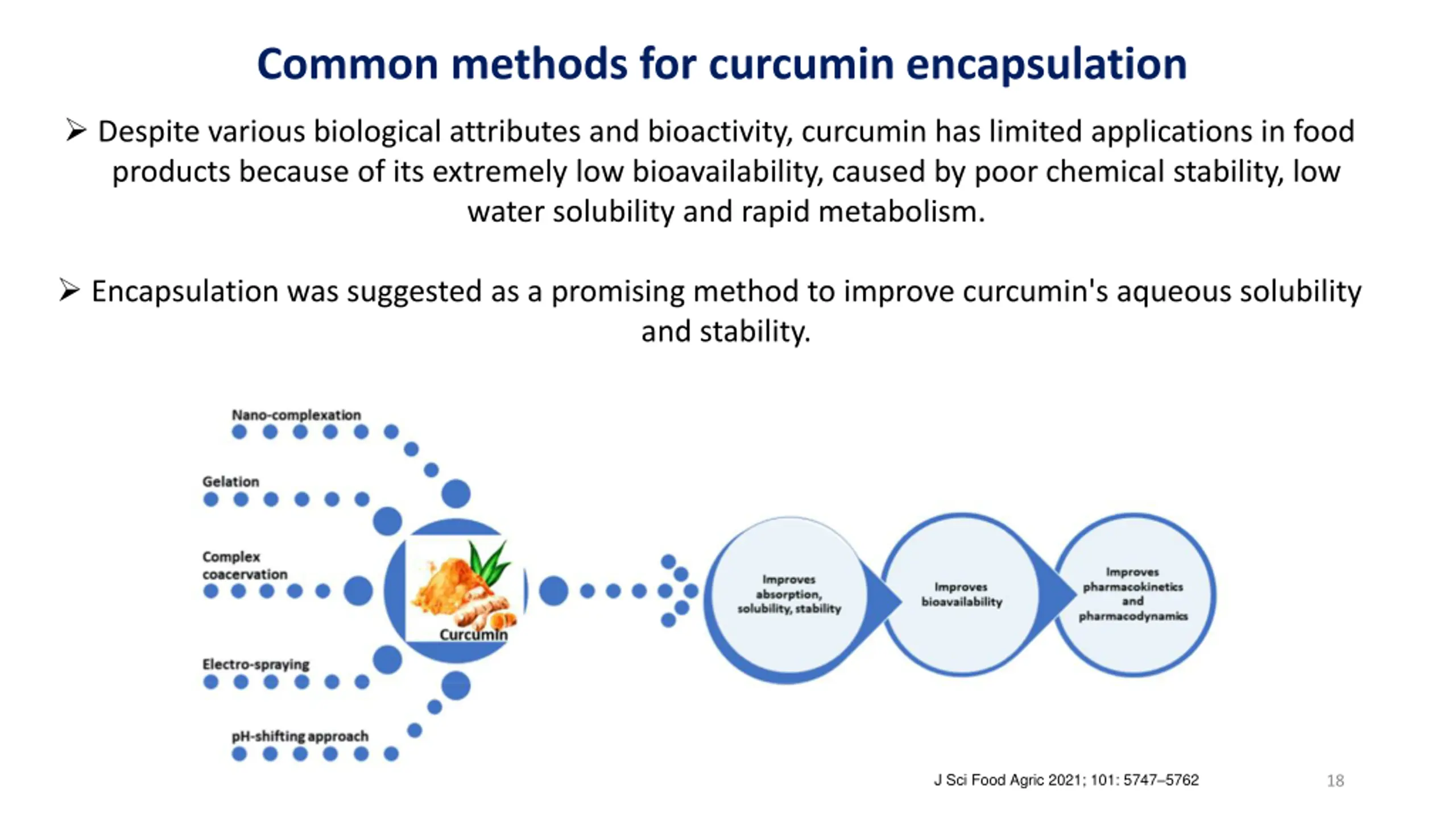 Common methods for curcumin encapsulation Despite various biological attributes and bioactivity, curcumin has limited applications in food products because of its extremely low bioavailability, caused by poor chemical stability, low water solubility and rapid metabolism. Encapsulation was suggested as a promising method to improve curcumin's aqueous solubility and stability. J Sci Food Agric 2021; 101: 5747–5762 18