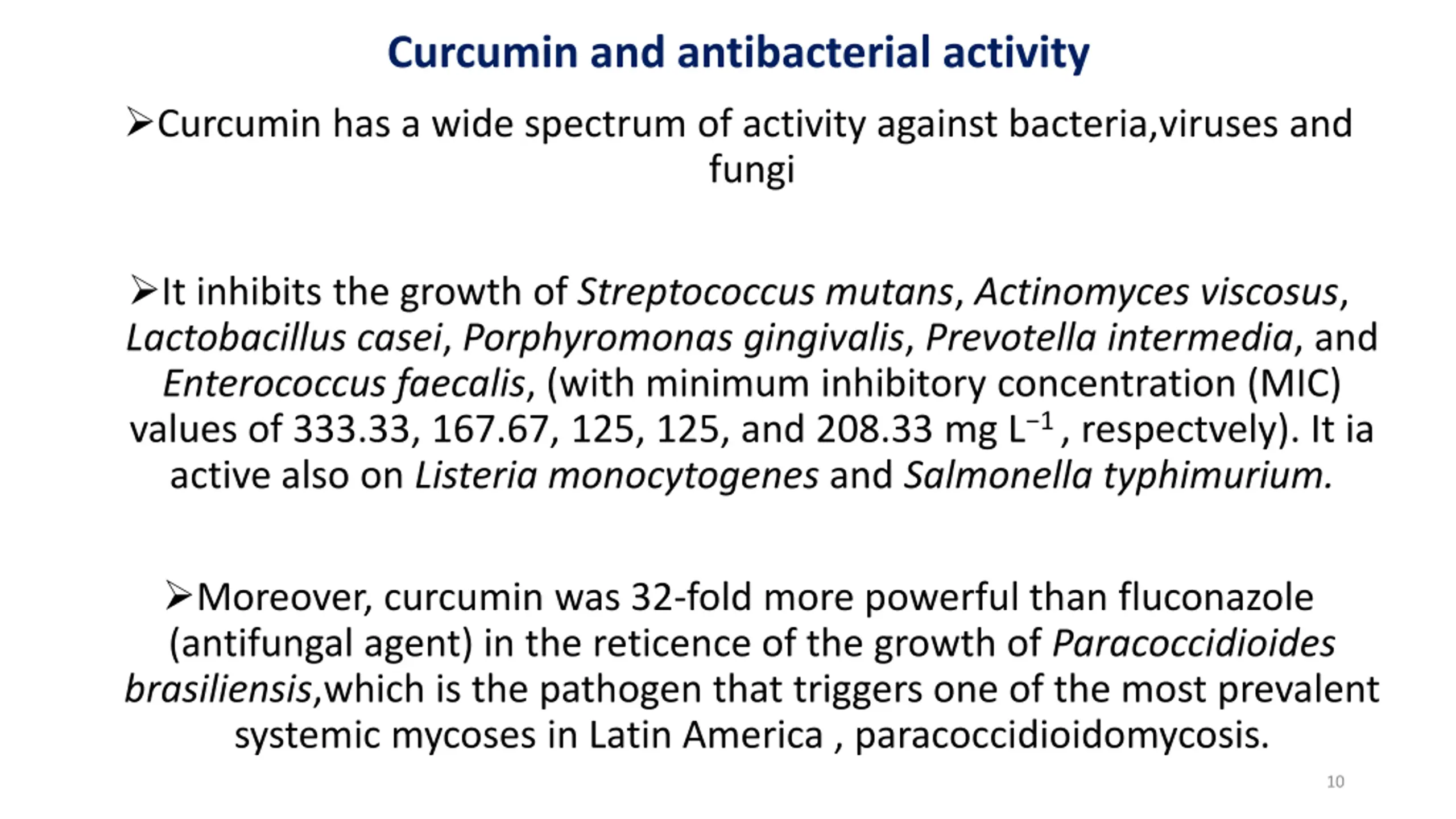 Curcumin and antibacterial activity Curcumin has a wide spectrum of activity against bacteria,viruses and fungi It inhibits the growth of Streptococcus mutans, Actinomyces viscosus, Lactobacillus casei, Porphyromonas gingivalis, Prevotella intermedia, and Enterococcus faecalis, (with minimum inhibitory concentration (MIC) values of 333.33, 167.67, 125, 125, and 208.33 mg L−1 , respectvely). It ia active also on Listeria monocytogenes and Salmonella typhimurium. Moreover, curcumin was 32-fold more powerful than fluconazole (antifungal agent) in the reticence of the growth of Paracoccidioides brasiliensis,which is the pathogen that triggers one of the most prevalent systemic mycoses in Latin America , paracoccidioidomycosis. 10