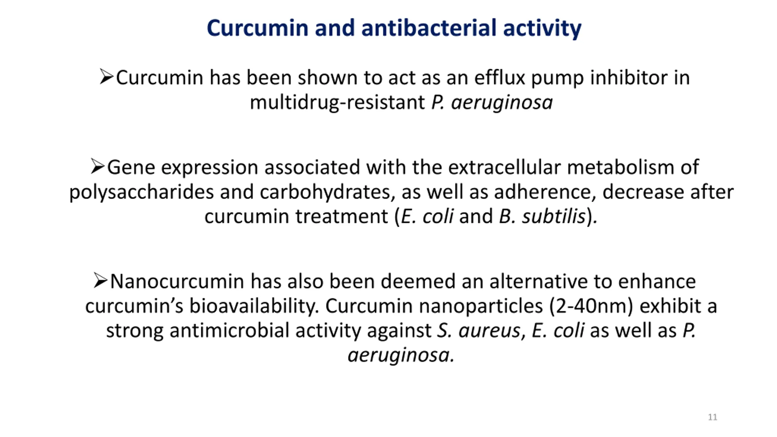 Curcumin and antibacterial activity Curcumin has been shown to act as an efflux pump inhibitor in multidrug-resistant P. aeruginosa Gene expression associated with the extracellular metabolism of polysaccharides and carbohydrates, as well as adherence, decrease after curcumin treatment (E. coli and B. subtilis). Nanocurcumin has also been deemed an alternative to enhance curcumin’s bioavailability. Curcumin nanoparticles (2-40nm) exhibit a strong antimicrobial activity against S. aureus, E. coli as well as P. aeruginosa. 11