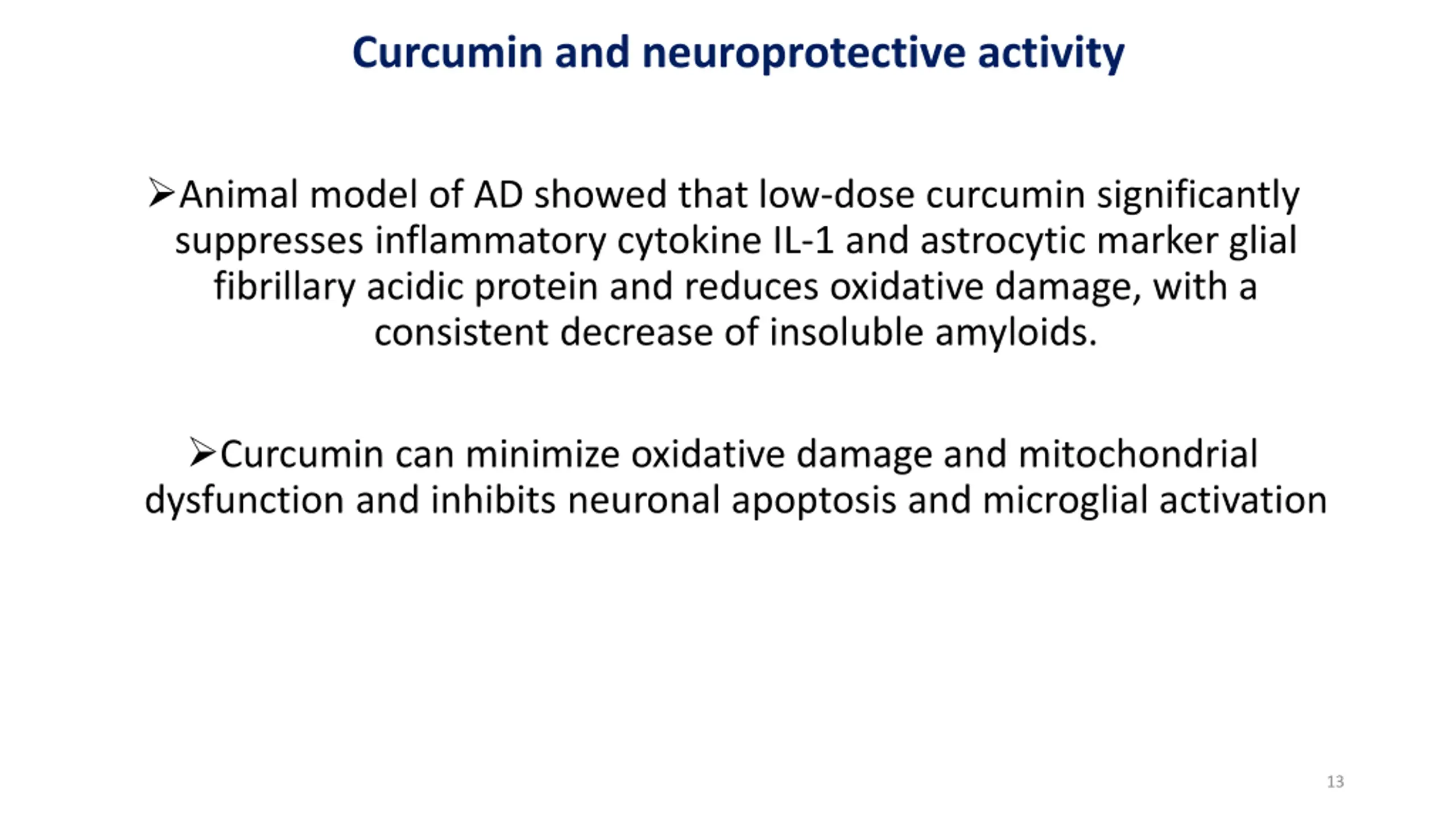 Curcumin and neuroprotective activity Animal model of AD showed that low-dose curcumin significantly suppresses inflammatory cytokine IL-1 and astrocytic marker glial fibrillary acidic protein and reduces oxidative damage, with a consistent decrease of insoluble amyloids. Curcumin can minimize oxidative damage and mitochondrial dysfunction and inhibits neuronal apoptosis and microglial activation 13