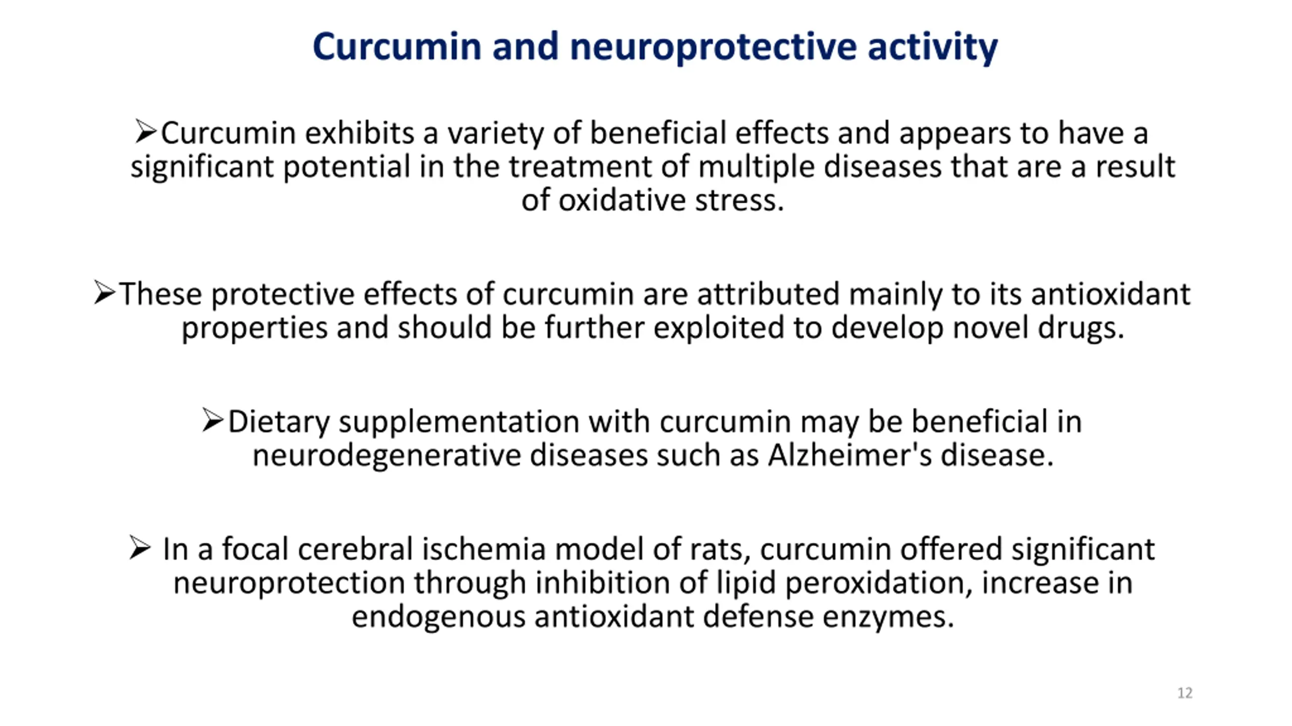 Curcumin and neuroprotective activity Curcumin exhibits a variety of beneficial effects and appears to have a significant potential in the treatment of multiple diseases that are a result of oxidative stress. These protective effects of curcumin are attributed mainly to its antioxidant properties and should be further exploited to develop novel drugs. Dietary supplementation with curcumin may be beneficial in neurodegenerative diseases such as Alzheimer's disease. In a focal cerebral ischemia model of rats, curcumin offered significant neuroprotection through inhibition of lipid peroxidation, increase in endogenous antioxidant defense enzymes. 12