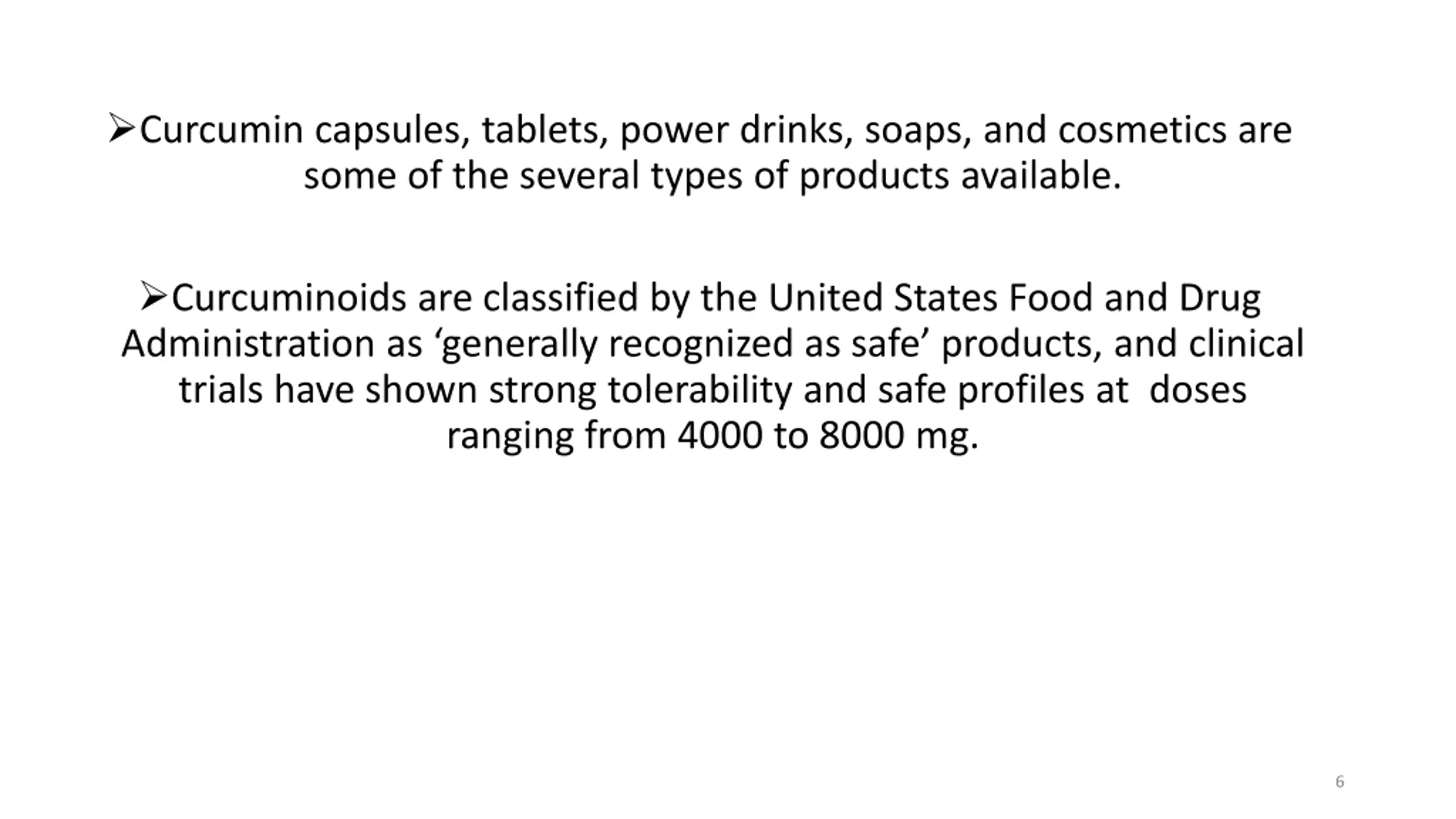 Curcumin capsules, tablets, power drinks, soaps, and cosmetics are some of the several types of products available. Curcuminoids are classified by the United States Food and Drug Administration as ‘generally recognized as safe’ products, and clinical trials have shown strong tolerability and safe profiles at doses ranging from 4000 to 8000 mg. 6