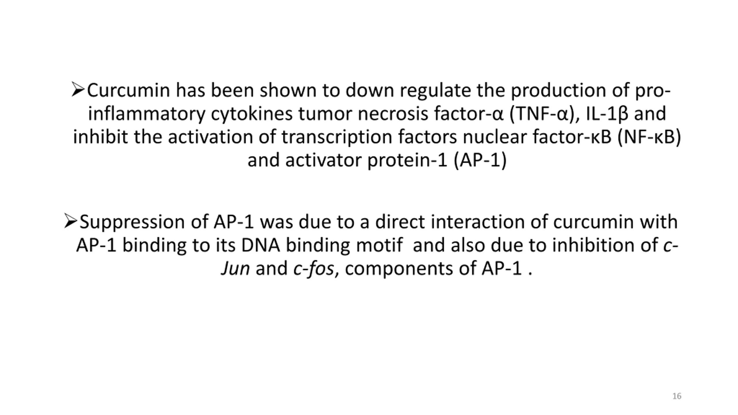 Curcumin has been shown to down regulate the production of pro- inflammatory cytokines tumor necrosis factor-α (TNF-α), IL-1β and inhibit the activation of transcription factors nuclear factor-κB (NF-κB) and activator protein-1 (AP-1) Suppression of AP-1 was due to a direct interaction of curcumin with AP-1 binding to its DNA binding motif and also due to inhibition of c- Jun and c-fos, components of AP-1 . 16