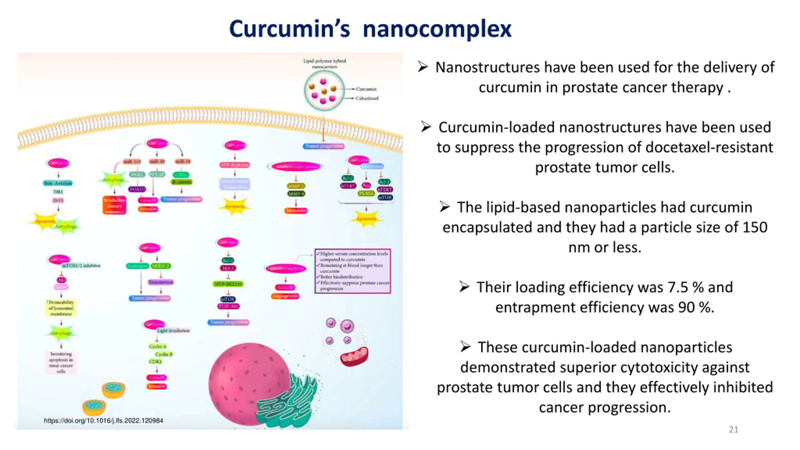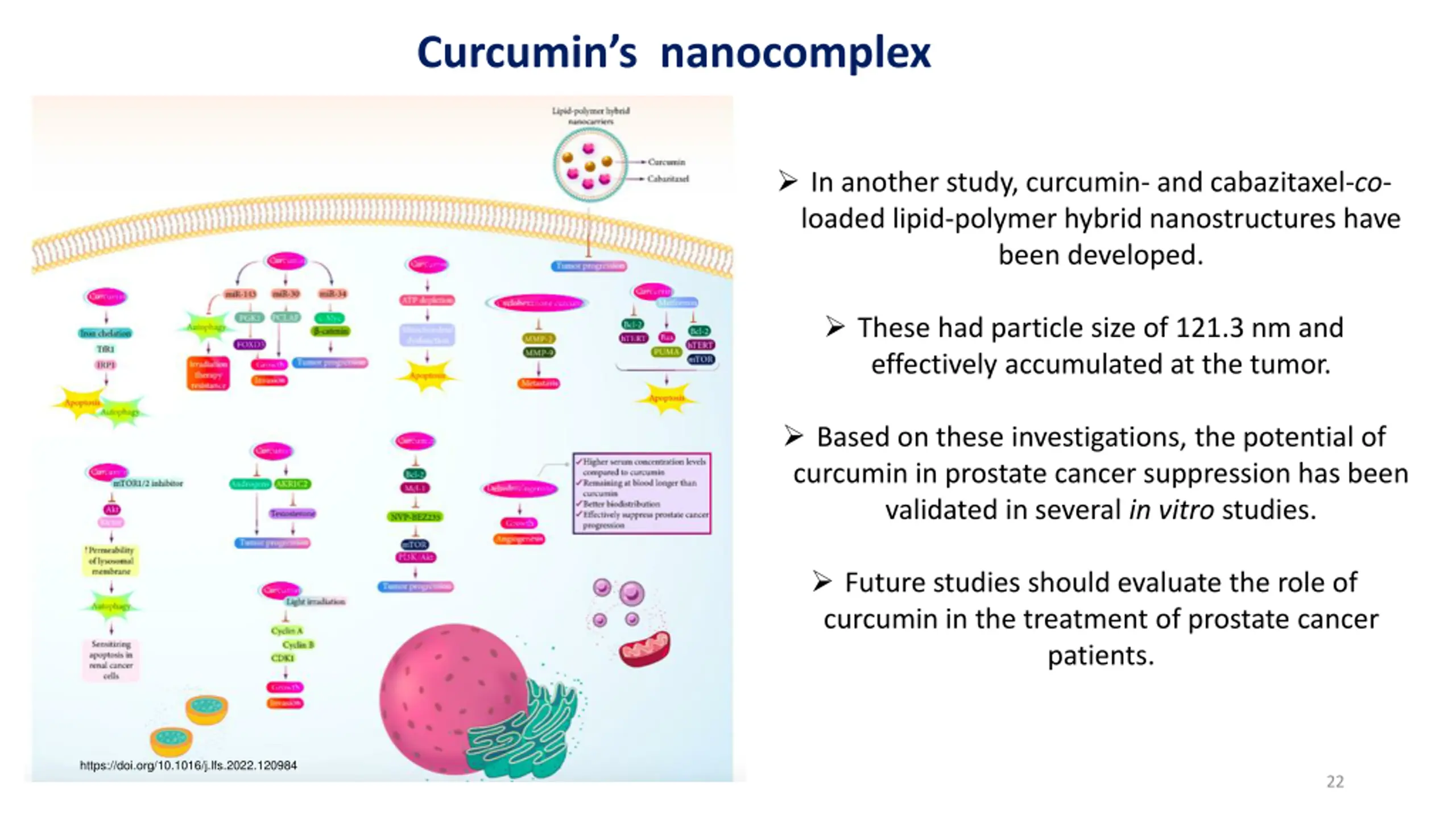 Curcumin’s nanocomplex In another study, curcumin- and cabazitaxel-co- loaded lipid-polymer hybrid nanostructures have been developed. These had particle size of 121.3 nm and effectively accumulated at the tumor. Based on these investigations, the potential of curcumin in prostate cancer suppression has been validated in several in vitro studies. Future studies should evaluate the role of curcumin in the treatment of prostate cancer patients. https://doi.org/10.1016/j.lfs.2022.120984 22