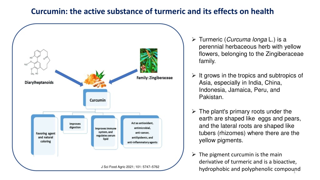 Curcumin: the active substance of turmeric and its effects on health Turmeric (Curcuma longa L.) is a perennial herbaceous herb with yellow flowers, belonging to the Zingiberaceae family. It grows in the tropics and subtropics of Asia, especially in India, China, Indonesia, Jamaica, Peru, and Pakistan. The plant's primary roots under the earth are shaped like eggs and pears, and the lateral roots are shaped like tubers (rhizomes) where there are the yellow pigments. The pigment curcumin is the main derivative of turmeric and is a bioactive, hydrophobic and polyphenolic compound J Sci Food Agric 2021; 101: 5747–5762 1
