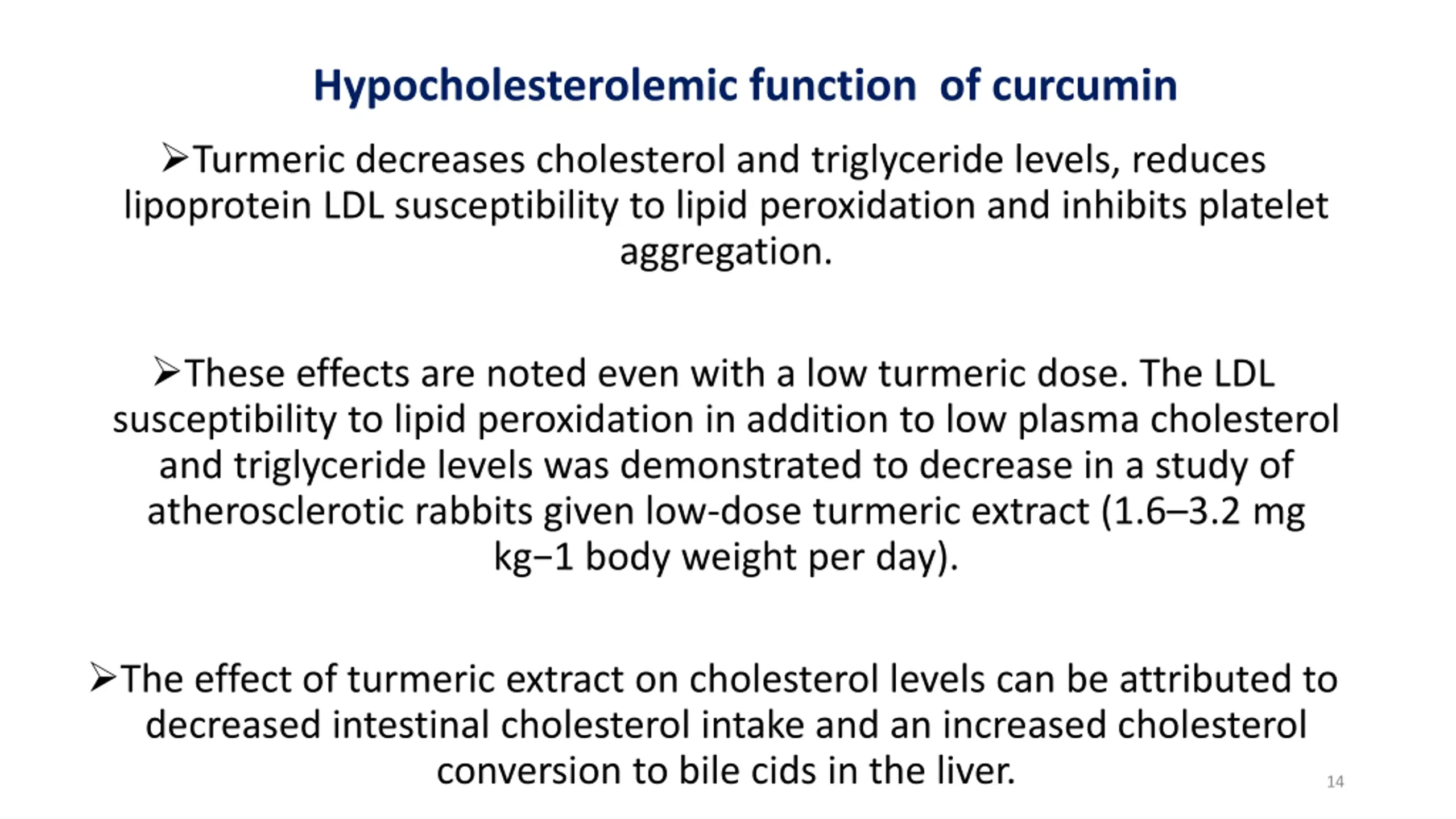 Hypocholesterolemic function of curcumin Turmeric decreases cholesterol and triglyceride levels, reduces lipoprotein LDL susceptibility to lipid peroxidation and inhibits platelet aggregation. These effects are noted even with a low turmeric dose. The LDL susceptibility to lipid peroxidation in addition to low plasma cholesterol and triglyceride levels was demonstrated to decrease in a study of atherosclerotic rabbits given low-dose turmeric extract (1.6–3.2 mg kg−1 body weight per day). The effect of turmeric extract on cholesterol levels can be attributed to decreased intestinal cholesterol intake and an increased cholesterol conversion to bile cids in the liver. 14