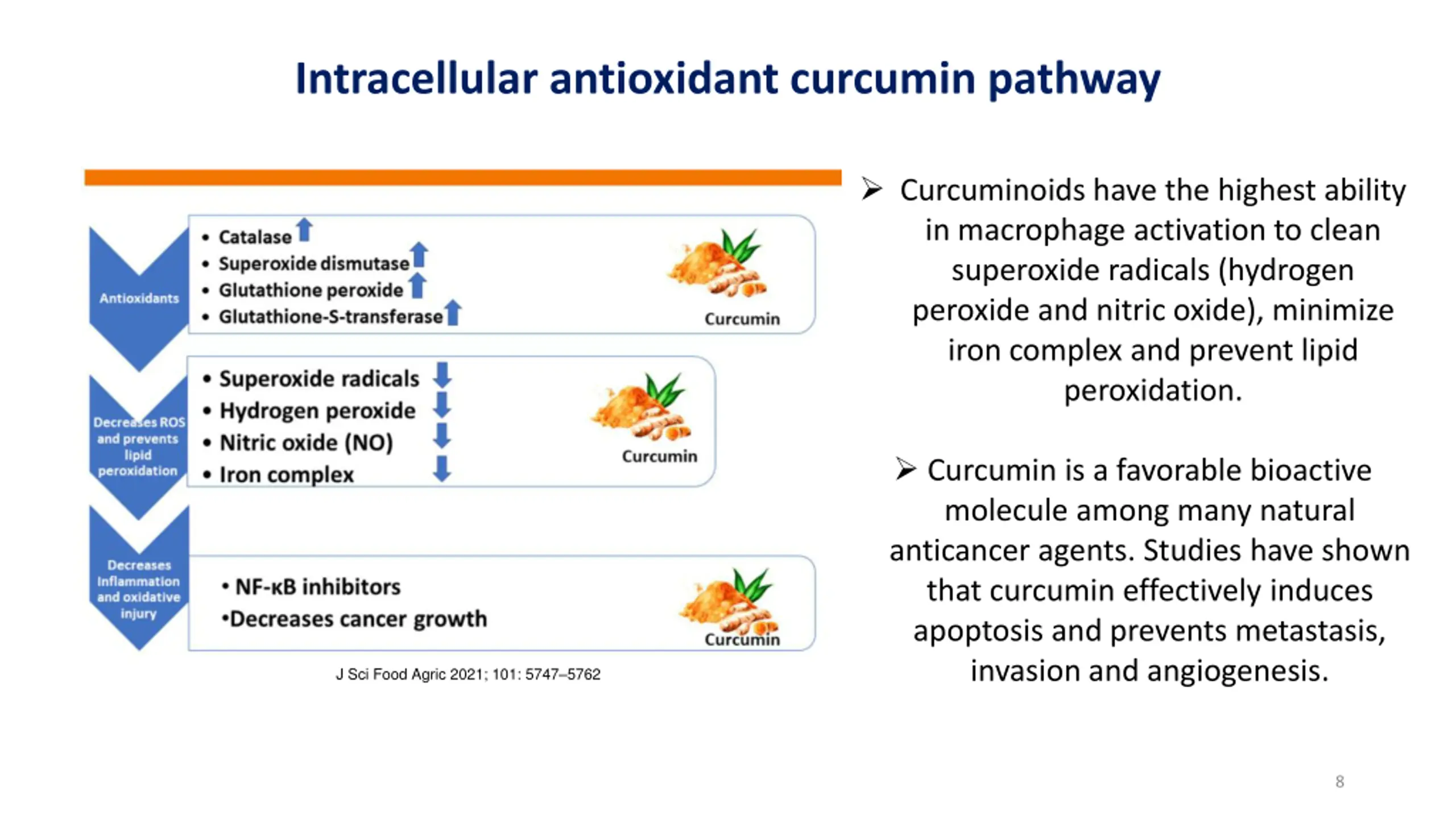 Intracellular antioxidant curcumin pathway Curcuminoids have the highest ability in macrophage activation to clean superoxide radicals (hydrogen peroxide and nitric oxide), minimize iron complex and prevent lipid peroxidation. Curcumin is a favorable bioactive molecule among many natural anticancer agents. Studies have shown that curcumin effectively induces apoptosis and prevents metastasis, invasion and angiogenesis. J Sci Food Agric 2021; 101: 5747–5762 8