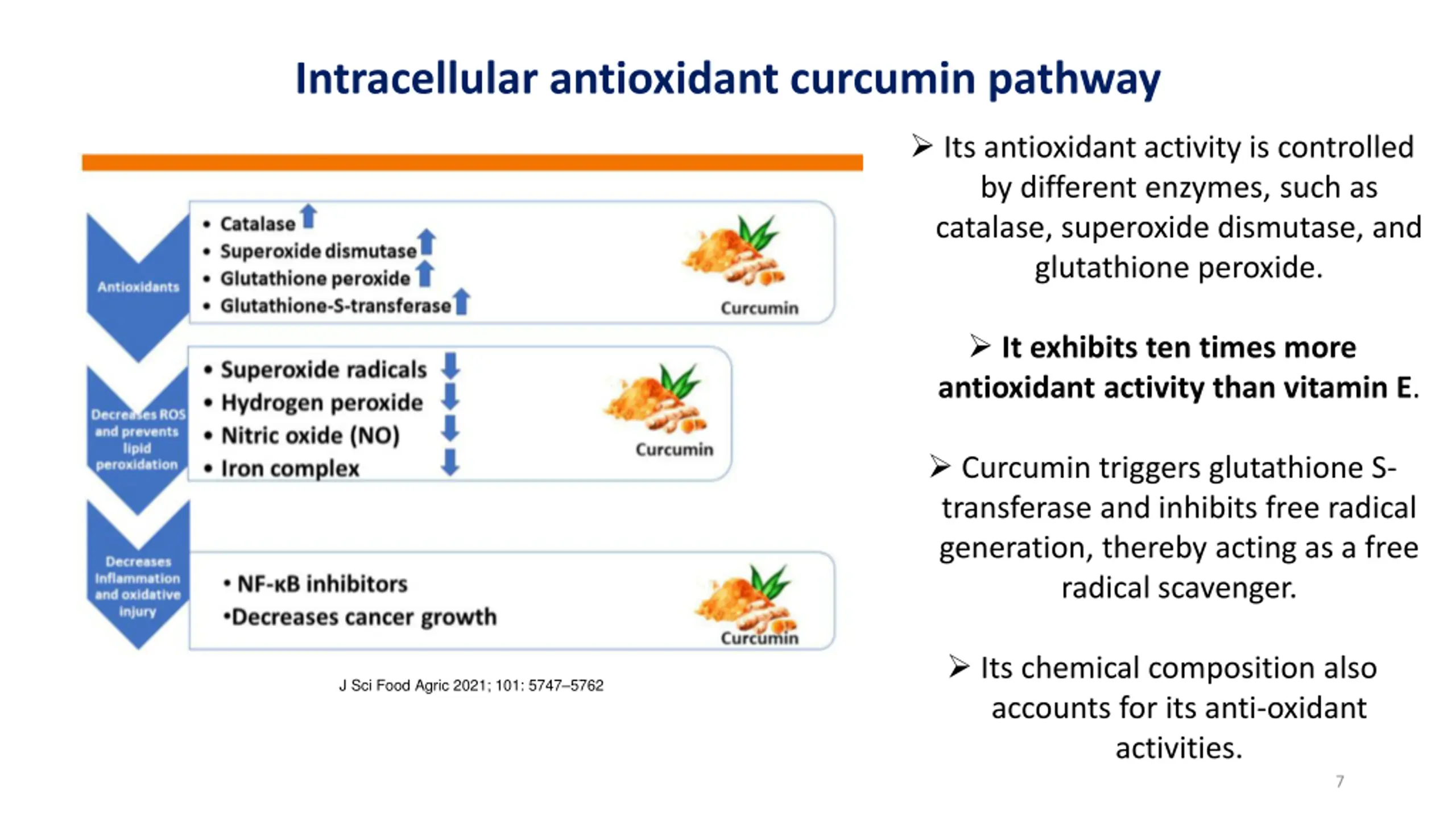 Intracellular antioxidant curcumin pathway Its antioxidant activity is controlled by different enzymes, such as catalase, superoxide dismutase, and glutathione peroxide. It exhibits ten times more antioxidant activity than vitamin E. Curcumin triggers glutathione S- transferase and inhibits free radical generation, thereby acting as a free radical scavenger. Its chemical composition also accounts for its anti-oxidant activities. J Sci Food Agric 2021; 101: 5747–5762 7
