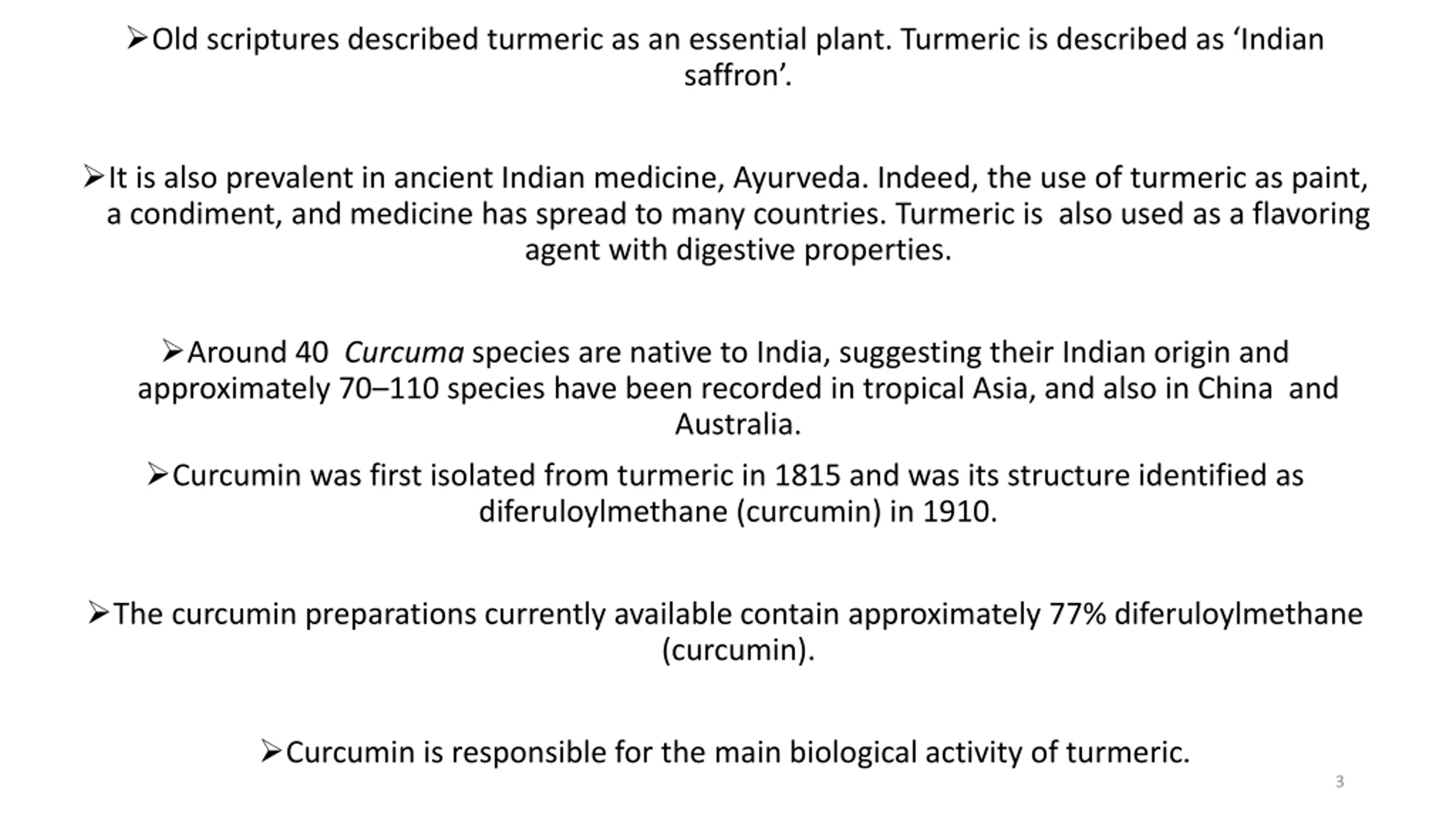 Old scriptures described turmeric as an essential plant. Turmeric is described as ‘Indian saffron’. It is also prevalent in ancient Indian medicine, Ayurveda. Indeed, the use of turmeric as paint, a condiment, and medicine has spread to many countries. Turmeric is also used as a flavoring agent with digestive properties. Around 40 Curcuma species are native to India, suggesting their Indian origin and approximately 70–110 species have been recorded in tropical Asia, and also in China and Australia. Curcumin was first isolated from turmeric in 1815 and was its structure identified as diferuloylmethane (curcumin) in 1910. The curcumin preparations currently available contain approximately 77% diferuloylmethane (curcumin). Curcumin is responsible for the main biological activity of turmeric. 3