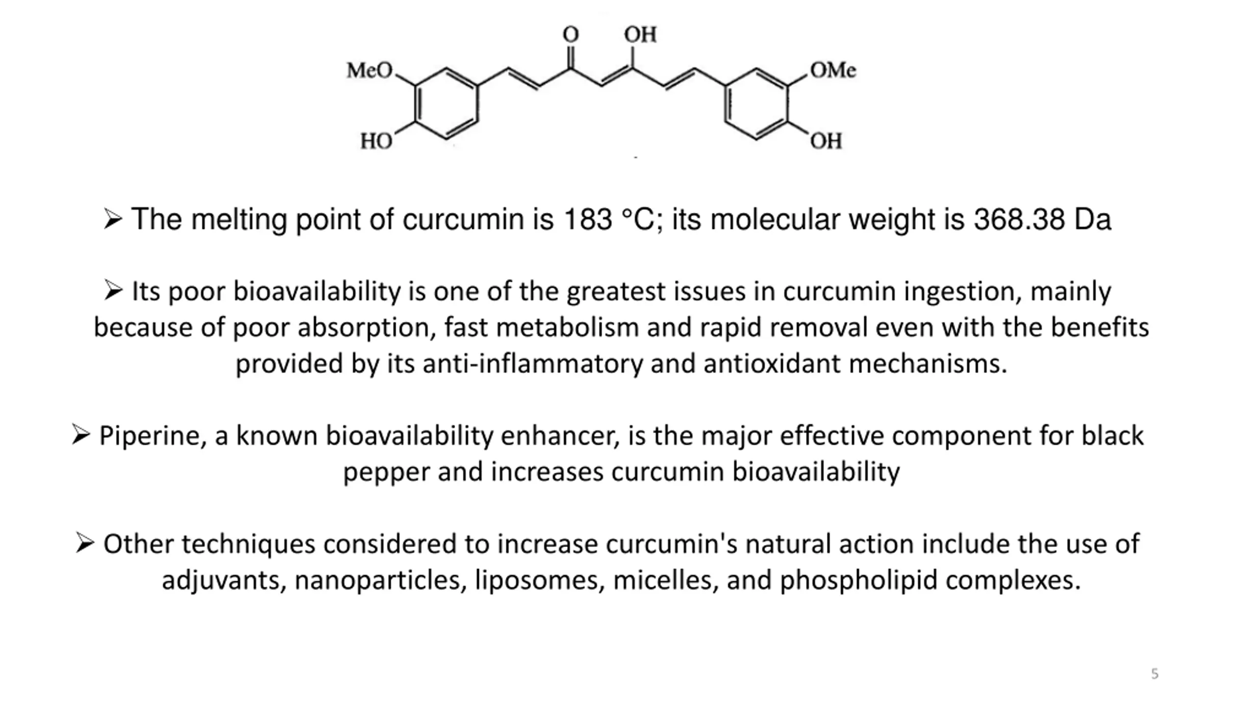 The melting point of curcumin is 183 °C; its molecular weight is 368.38 Da Its poor bioavailability is one of the greatest issues in curcumin ingestion, mainly because of poor absorption, fast metabolism and rapid removal even with the benefits provided by its anti-inflammatory and antioxidant mechanisms. Piperine, a known bioavailability enhancer, is the major effective component for black pepper and increases curcumin bioavailability Other techniques considered to increase curcumin's natural action include the use of adjuvants, nanoparticles, liposomes, micelles, and phospholipid complexes. 5