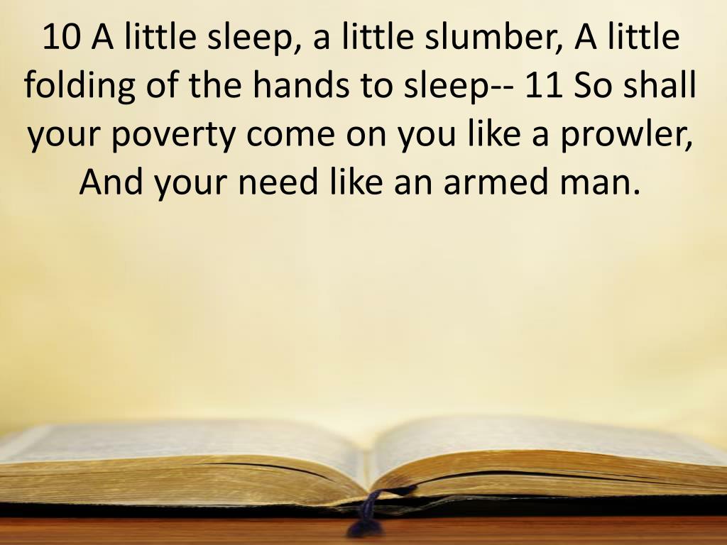 10 A little sleep, a little slumber, A little folding of the hands to sleep-- 11 So shall your poverty come on you like a prowler, And your need like an armed man.