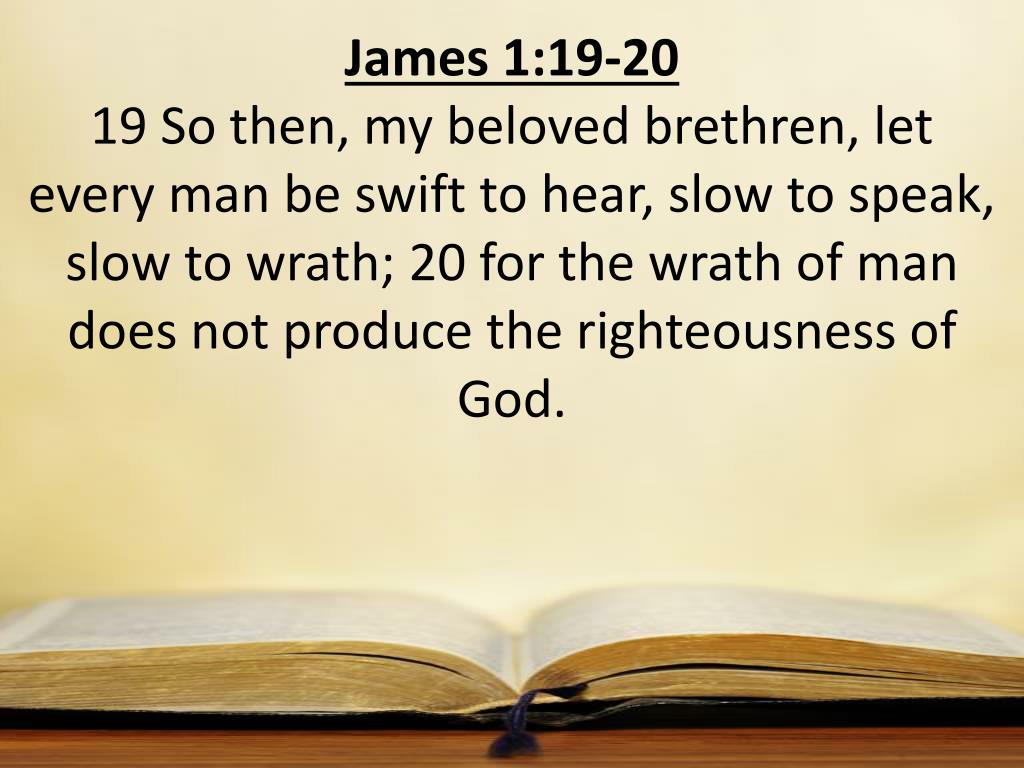 James 1:19-20 19 So then, my beloved brethren, let every man be swift to hear, slow to speak, slow to wrath; 20 for the wrath of man does not produce the righteousness of God.