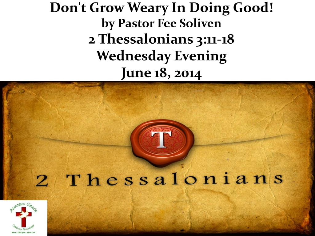 Don't Grow Weary In Doing Good! by Pastor Fee Soliven 2 Thessalonians 3:11-18 Wednesday Evening June 18, 2014. 11 For we hear that there are some who walk among you in a disorderly manner, not working at all, but are busybodies. .