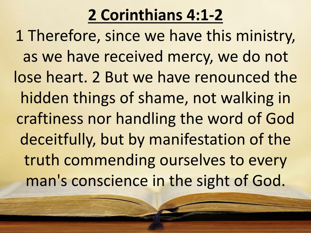 2 Corinthians 4:1-2 1 Therefore, since we have this ministry, as we have received mercy, we do not lose heart. 2 But we have renounced the hidden things of shame, not walking in craftiness nor handling the word of God deceitfully, but by manifestation of the truth commending ourselves to every man's conscience in the sight of God.