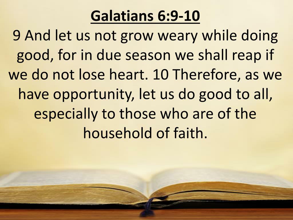 Galatians 6:9-10 9 And let us not grow weary while doing good, for in due season we shall reap if we do not lose heart. 10 Therefore, as we have opportunity, let us do good to all, especially to those who are of the household of faith.