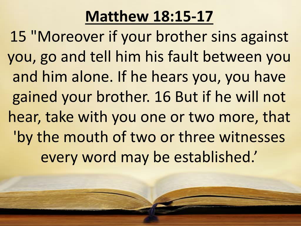 Matthew 18:15-17 15 "Moreover if your brother sins against you, go and tell him his fault between you and him alone. If he hears you, you have gained your brother. 16 But if he will not hear, take with you one or two more, that 'by the mouth of two or three witnesses every word may be established.’