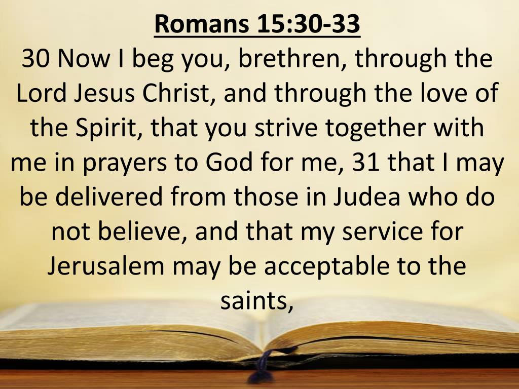 Romans 15:30-33 30 Now I beg you, brethren, through the Lord Jesus Christ, and through the love of the Spirit, that you strive together with me in prayers to God for me, 31 that I may be delivered from those in Judea who do not believe, and that my service for Jerusalem may be acceptable to the saints,