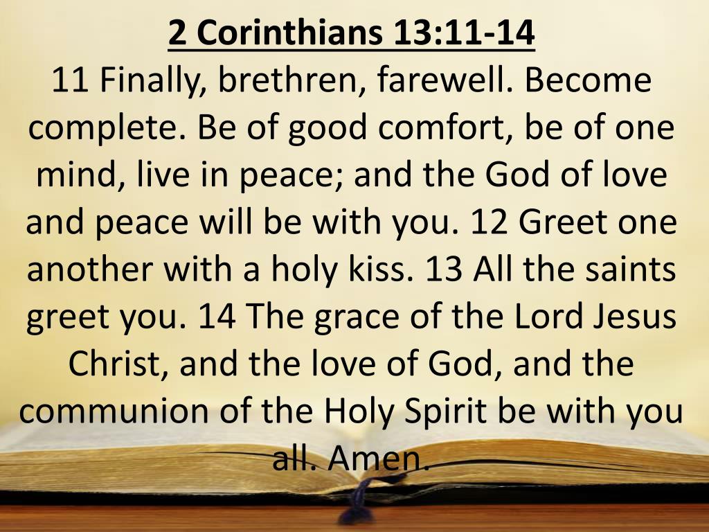 2 Corinthians 13:11-14 11 Finally, brethren, farewell. Become complete. Be of good comfort, be of one mind, live in peace; and the God of love and peace will be with you. 12 Greet one another with a holy kiss. 13 All the saints greet you. 14 The grace of the Lord Jesus Christ, and the love of God, and the communion of the Holy Spirit be with you all. Amen.