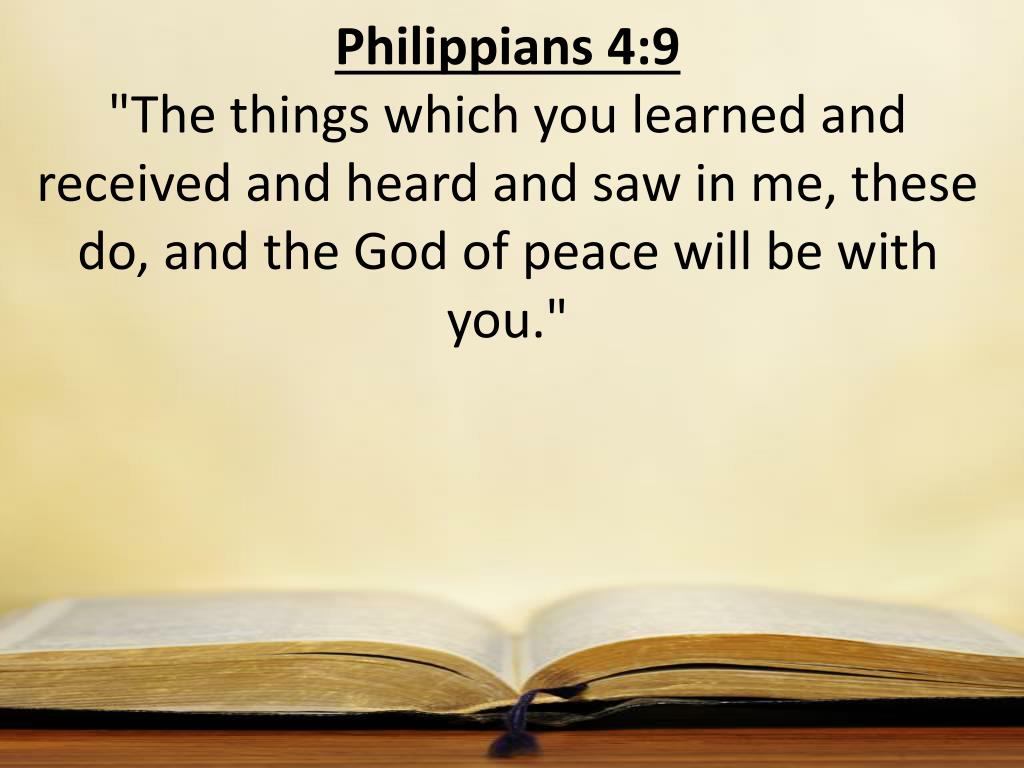 Philippians 4:9 "The things which you learned and received and heard and saw in me, these do, and the God of peace will be with you."