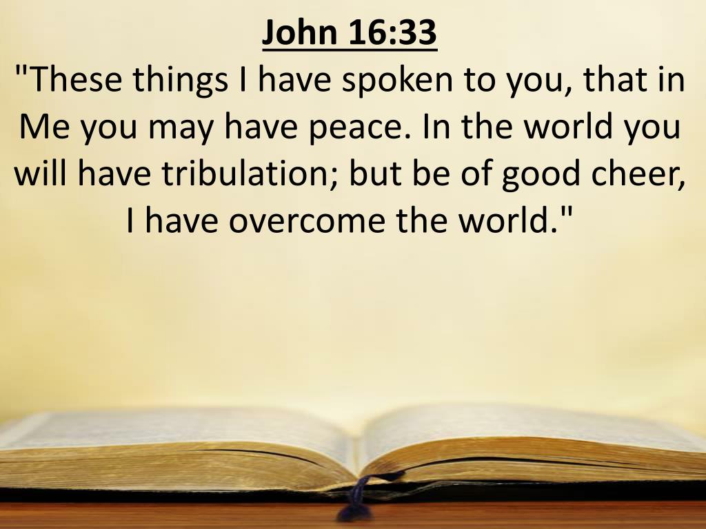 John 16:33 "These things I have spoken to you, that in Me you may have peace. In the world you will have tribulation; but be of good cheer, I have overcome the world."