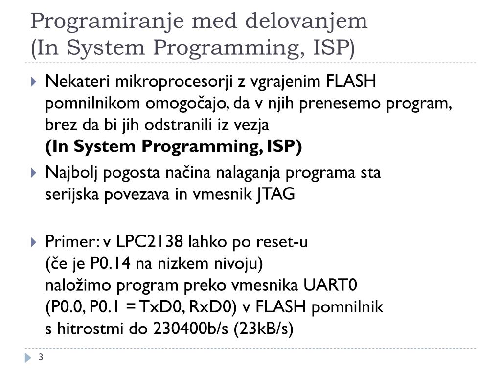 Programiranje med delovanjem(In System Programming, ISP) • Nekateri mikroprocesorji z vgrajenim FLASH pomnilnikom omogočajo, da v njih prenesemo program, brez da bi jih odstranili iz vezja (In System Programming, ISP) • Najbolj pogosta načina nalaganja programa sta serijska povezava in vmesnik JTAG • Primer: v LPC2138 lahko po reset-u (če je P0.14 na nizkem nivoju) naložimo program preko vmesnika UART0 (P0.0, P0.1 = TxD0, RxD0) v FLASH pomnilnik s hitrostmi do 230400b/s (23kB/s)