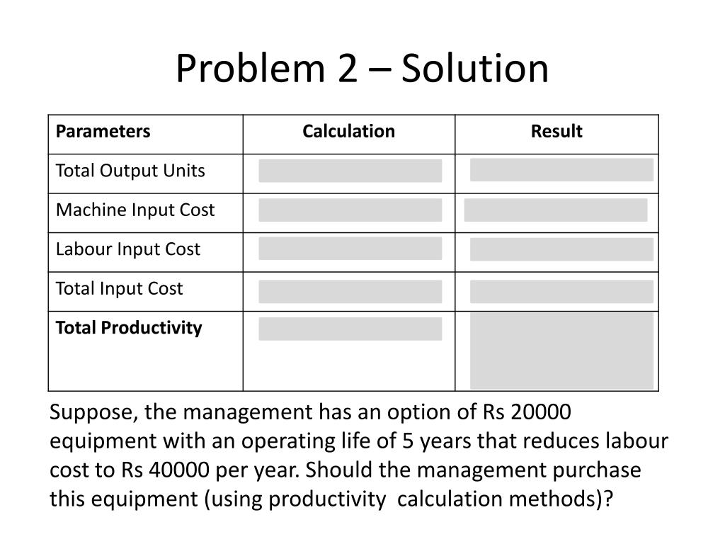 Problem 2 – Solution Suppose, the management has an option of Rs 20000 equipment with an operating life of 5 years that reduces labour cost to Rs 40000 per year. Should the management purchase this equipment (using productivity calculation methods)?
