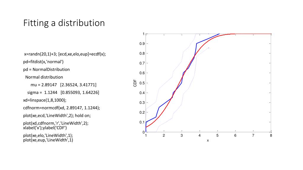 Fitting a distribution x=randn(20,1)+3; [ecd,xe,elo,eup]=ecdf(x); pd=fitdist(x,'normal') pd = NormalDistribution Normal distribution mu = 2.89147 [2.36524, 3.41771] sigma = 1.1244 [0.855093, 1.64226] xd=linspace(1,8,1000); cdfnorm=normcdf(xd, 2.89147, 1.1244); plot(xe,ecd,'LineWidth',2); hold on; plot(xd,cdfnorm,'r','LineWidth',2); xlabel('x');ylabel('CDF') plot(xe,elo,'LineWidth',1); plot(xe,eup,'LineWidth',1)