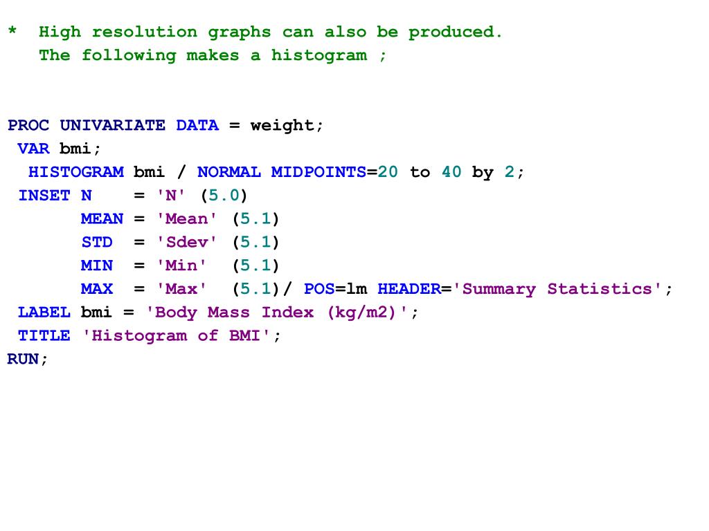 Examples of Comment Code * Run proc univariate for variable BMI; *---------------------------------------------------------------------* High resolution graphs can also be produced. The following makes a pdf file containing a histogram with the best fit normal curve and summary statistics. Other types of files such as GIF *---------------------------------------------------------------------*; PROCUNIVARIATEDATA = weight PLOT ; * ID patid ; VAR bmi; PROCUNIVARIATEDATA = weight /*PLOT*/; VAR bmi;