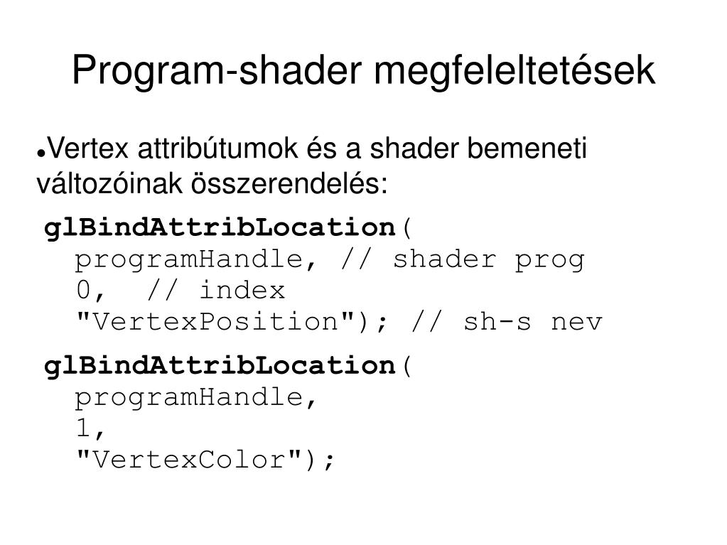 Program-shader megfeleltetések glGenVertexArrays( 1, &vaoHandle ); glBindVertexArray(vaoHandle); glEnableVertexAttribArray(0); // Vertexposition glEnableVertexAttribArray(1); // Vertexcolor glBindBuffer(GL_ARRAY_BUFFER, positionBufferHandle); glVertexAttribPointer( 0, 3, GL_FLOAT, GL_FALSE, 0, (GLubyte *)NULL ); glBindBuffer(GL_ARRAY_BUFFER, colorBufferHandle); glVertexAttribPointer( 1, 3, GL_FLOAT, GL_FALSE, 0, (GLubyte *)NULL );