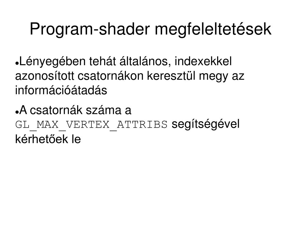 Program-shader megfeleltetések Lényegében tehát általános, indexekkel azonosított csatornákon keresztül megy az információátadás A csatornák száma a GL_MAX_VERTEX_ATTRIBS segítségével kérhetőek le