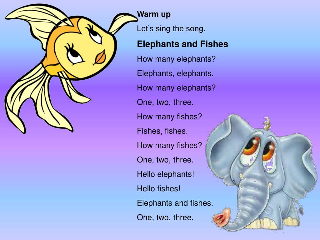 Warm up Let’s sing the song. Elephants and Fishes How many elephants? Elephants, elephants. How many elephants? One, two, three. How many fishes? Fishes, fishes. How many fishes? One, two, three. Hello elephants! Hello fishes! Elephants and fishes. One, two, three. 1.