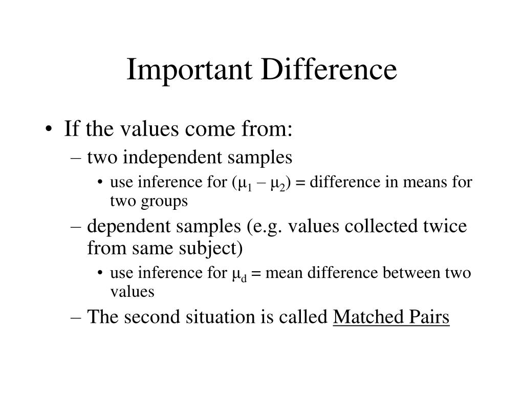 Important Difference • If the values come from: • two independent samples • use inference for (μ1 – μ2) = difference in means for two groups • dependent samples (e.g. values collected twice from same subject) • use inference for μd = mean difference between two values • The second situation is called Matched Pairs